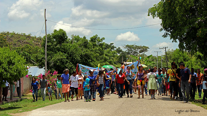 Santa Isabel, Cesar. Pueblo que alguna vez tuvo un letrero que decía «Se vende este pueblo». Pueblo que tuvo gente quemada, y cabezas colgadas en sus calles. Que perdió la pesca porque el río lo usaban para regar los monocultivos de palma. Sacralización y acompañamiento a las comunidades con artes. Gran recibimiento de la comunidad.